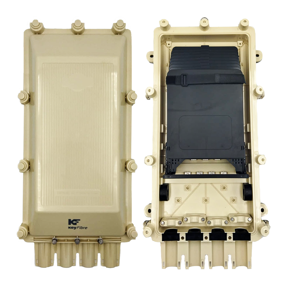 Estas cajas garantizan conexiones eficientes y de alta calidad, así como la organización interna de los soportes de fusión. Para uso exterior, ofrecen protección UV. Sus envolventes son extremadamente duraderas y resistentes, incluso bajo condiciones externas adversas. Además, presentan un diseño elegante y vienen con accesorios de anclaje, además de múltiples opciones de entradas y salidas para cables.